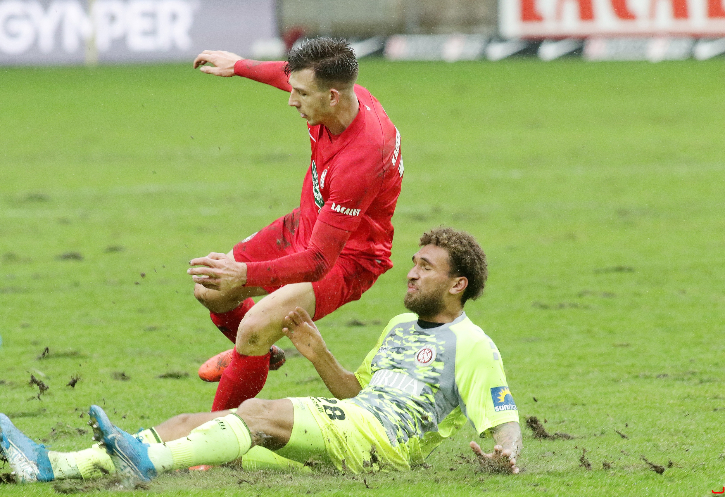 1. FC Kaiserslautern gegen SV Wehen Wiesbaden - Torschütze Kevin Lankford fällt Daniel Hanslik