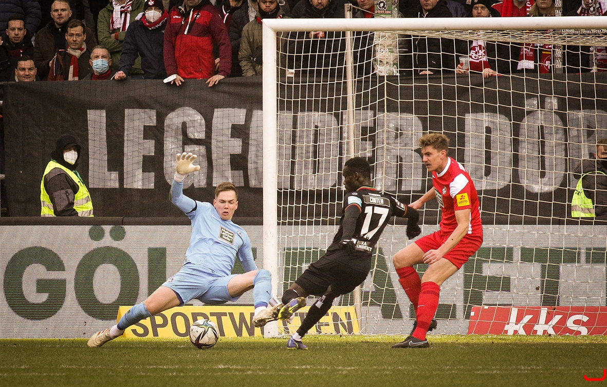 1. FC Kaiserslautern gegen 1. FC Magdeburg - Matheo Raab hält gegen Sirlord Conteh